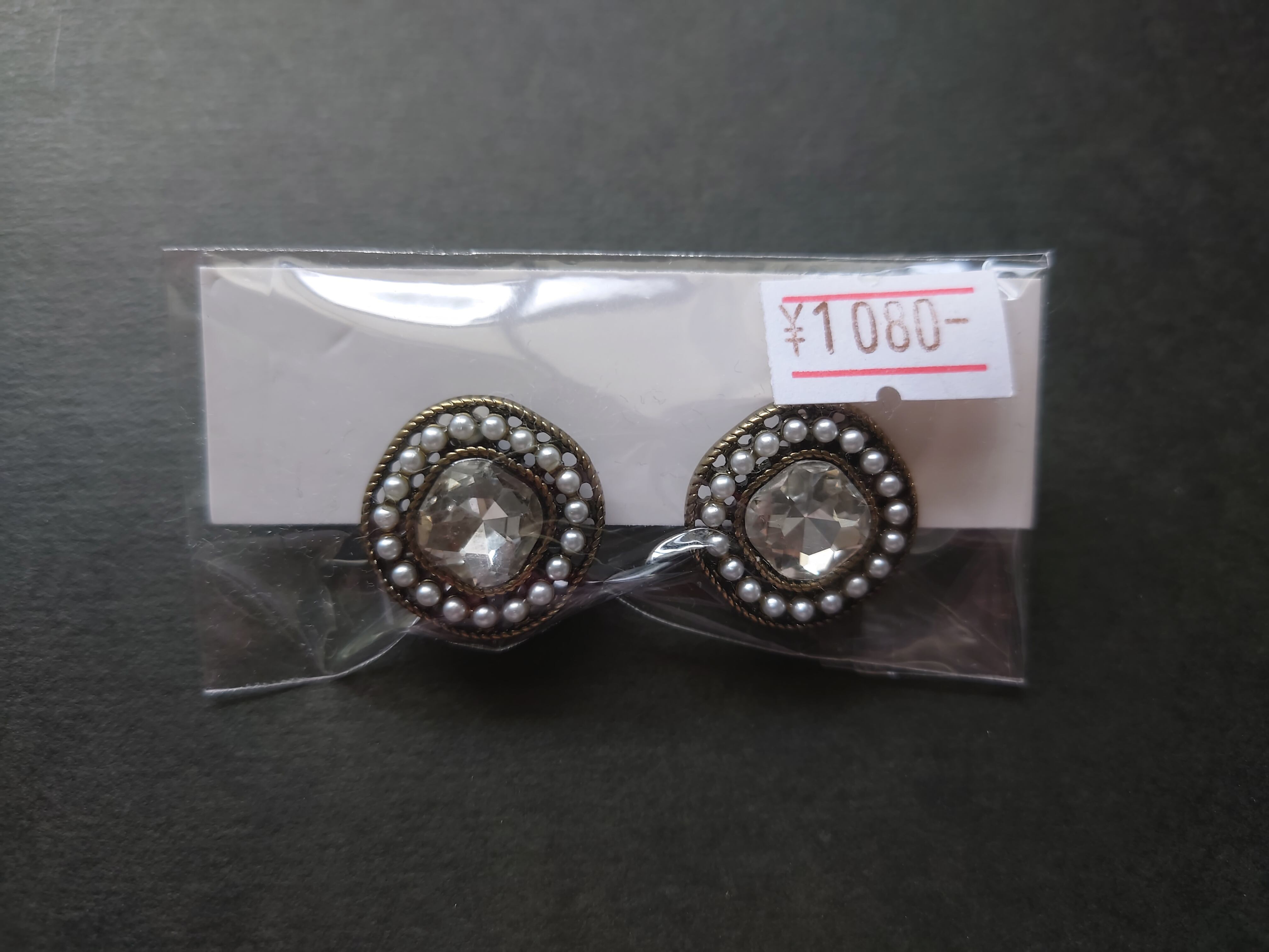 【値下げ在庫限り】イヤリング アンティーク調 キラキラ ビジュー パール調 丸みを帯びたスクエア 金古美