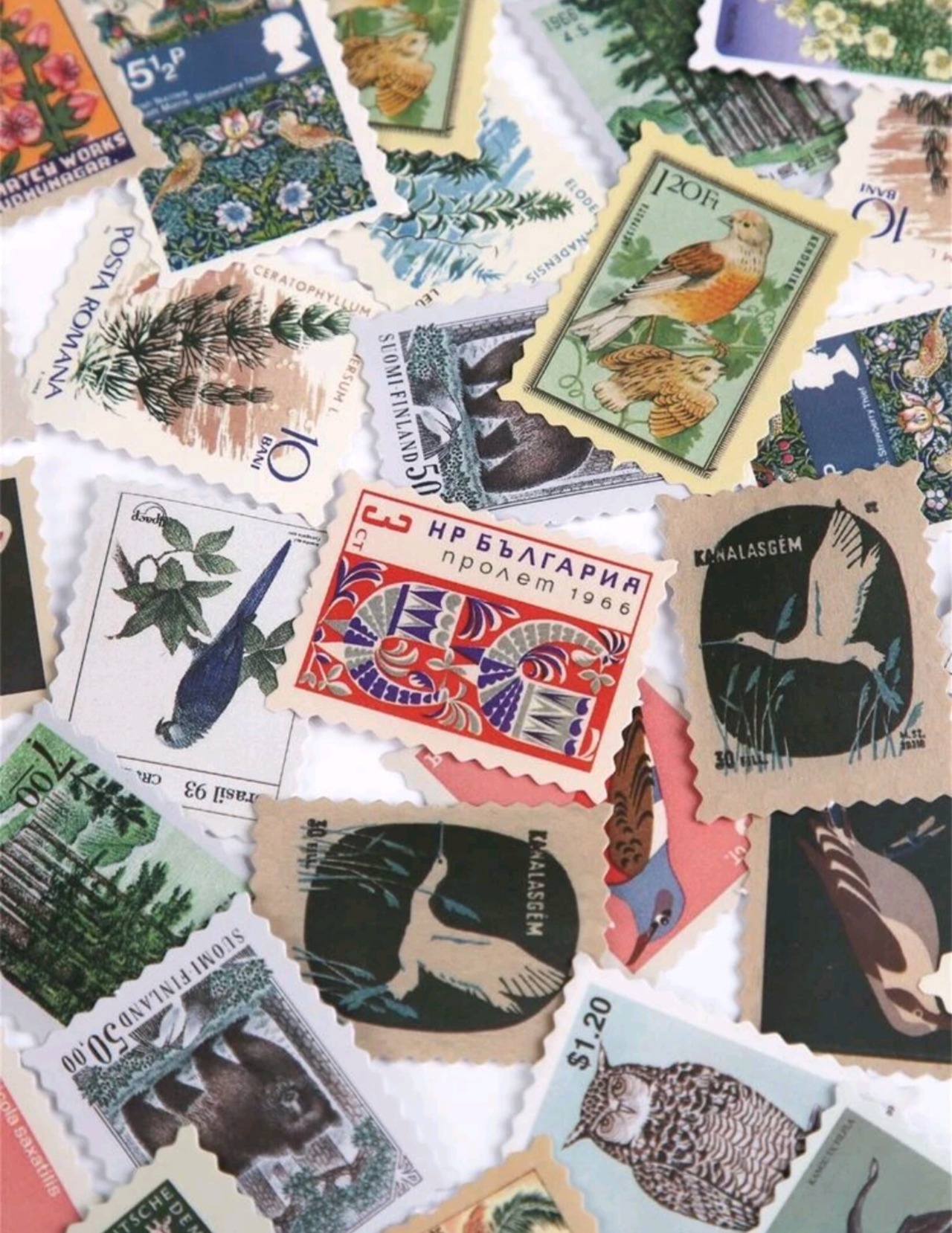 46枚 切手風 シール 鳥 動物 花 ハガキ風厚紙台紙
