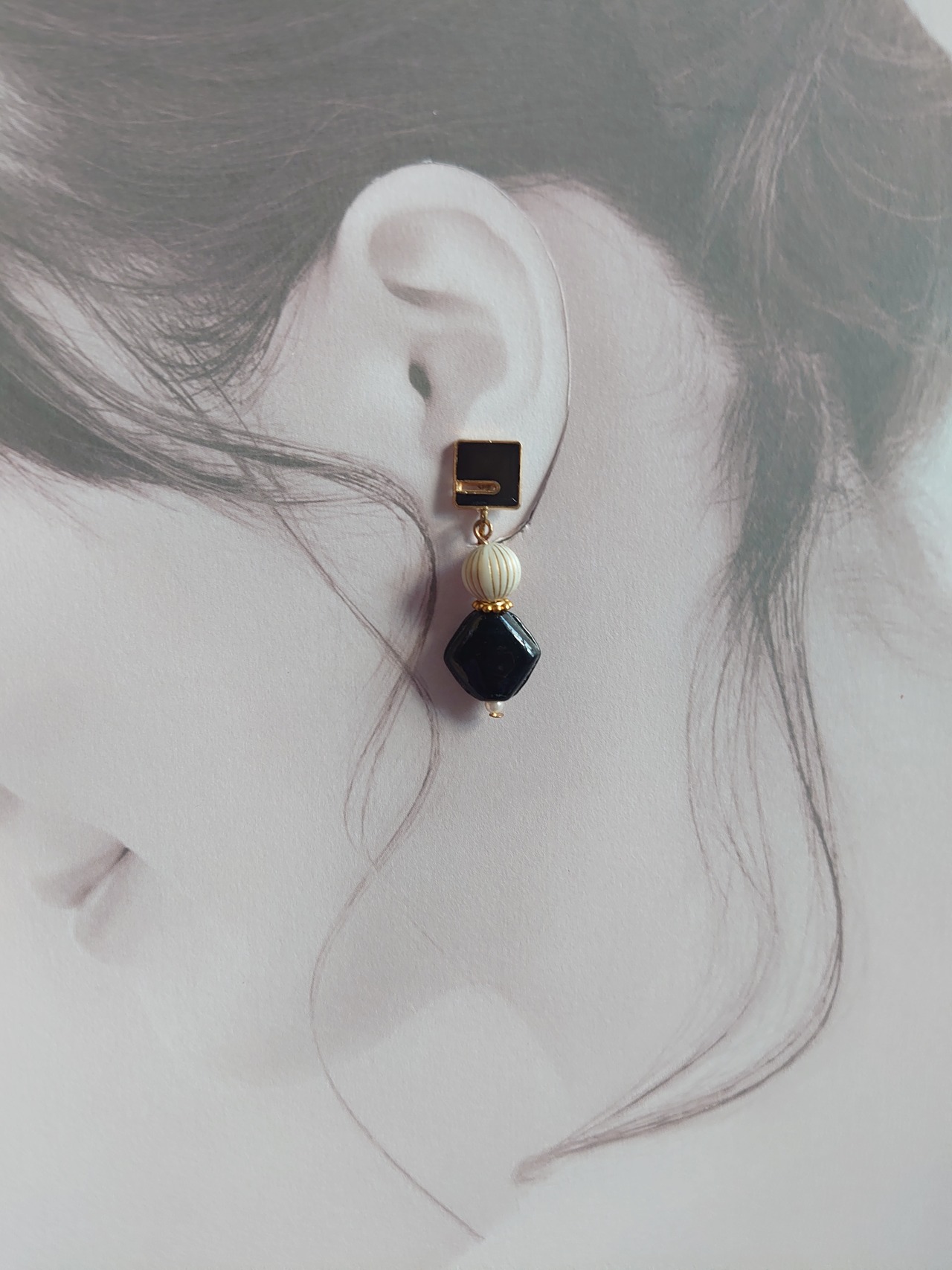 半額以下セール!スクエア ボタン × ブラックガラス アンティーク調アクリルメロンビーズ イヤリング / PohonhandmadeJewelry