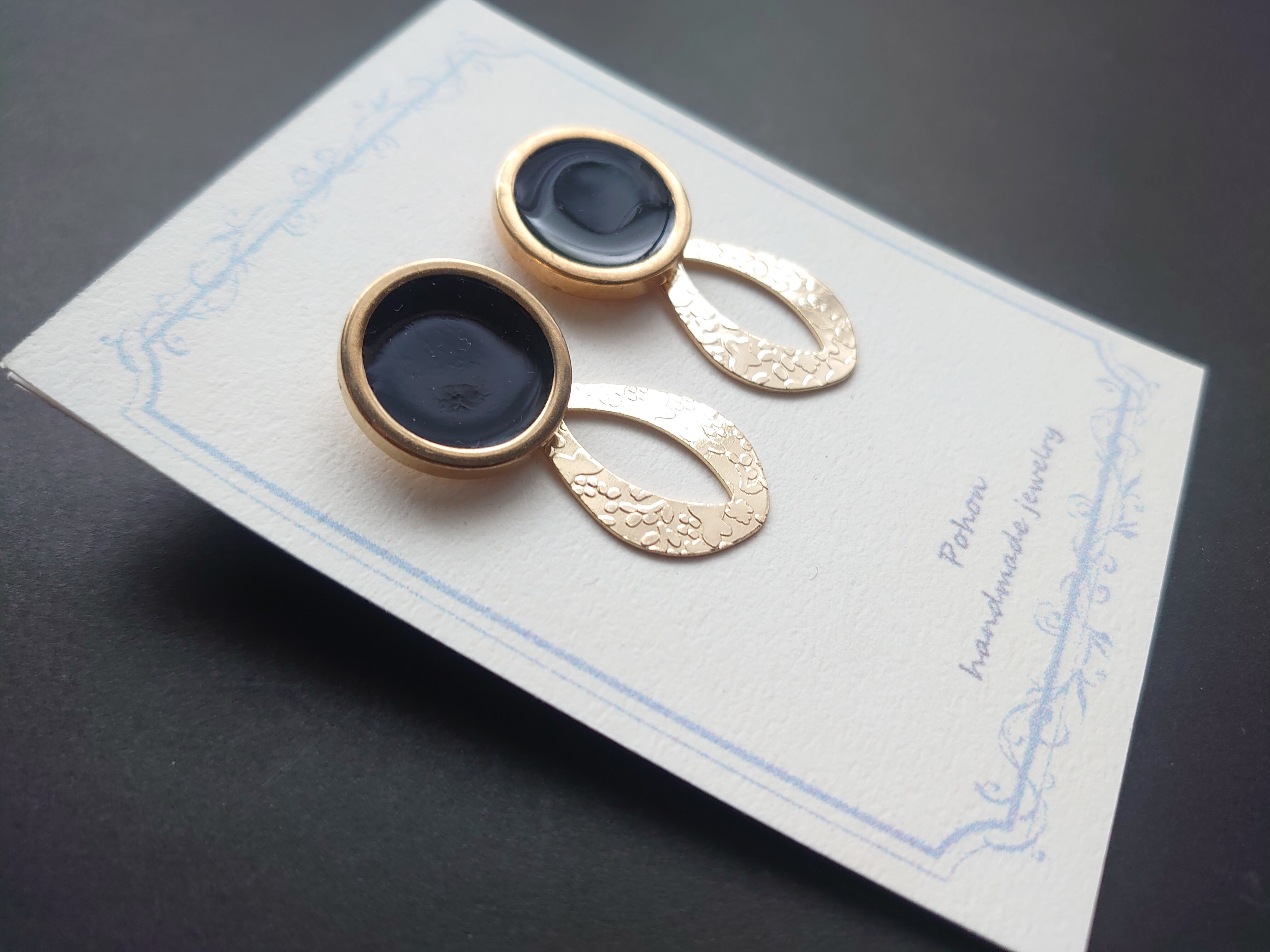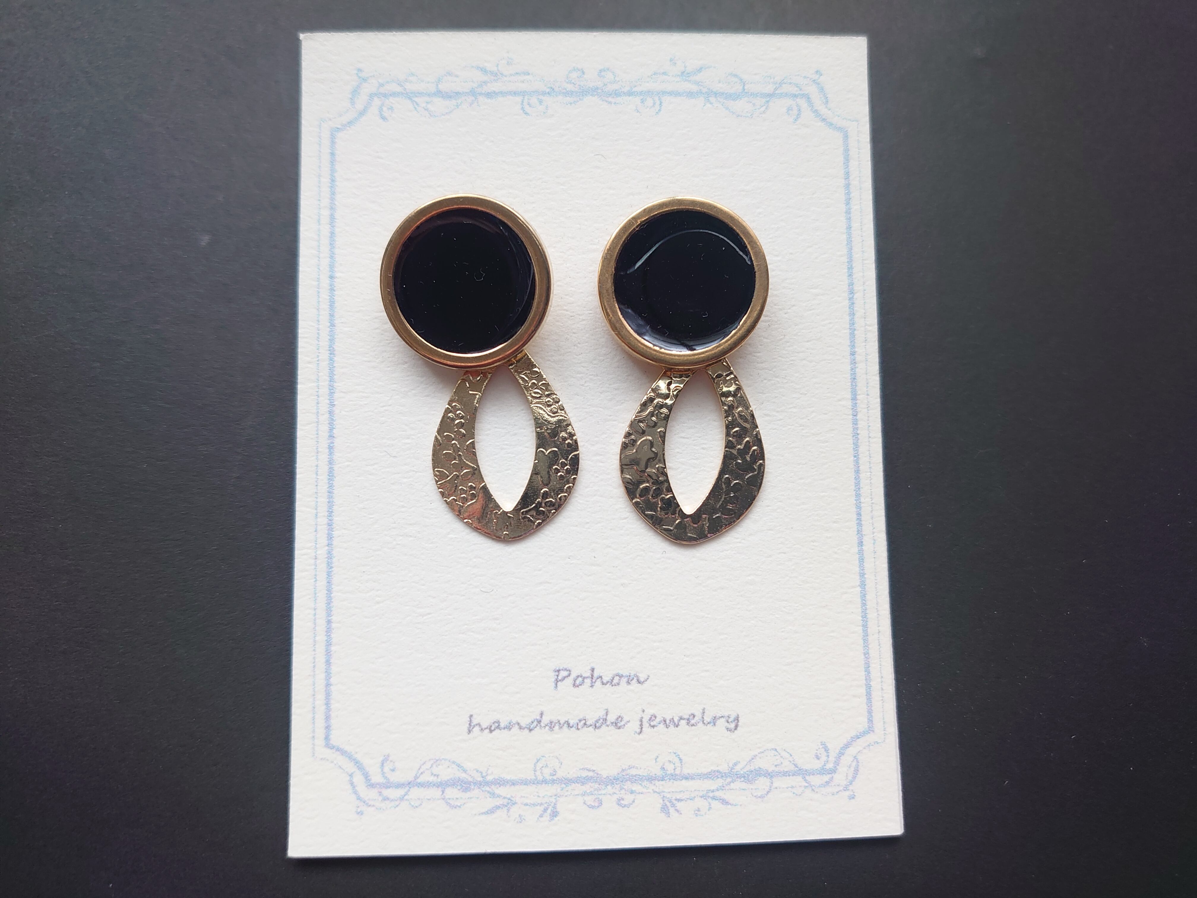 ボタン ゴールドライン ブラック ラウンド しずく ゴールド色 ピアス / PohonhandmadeJewelry