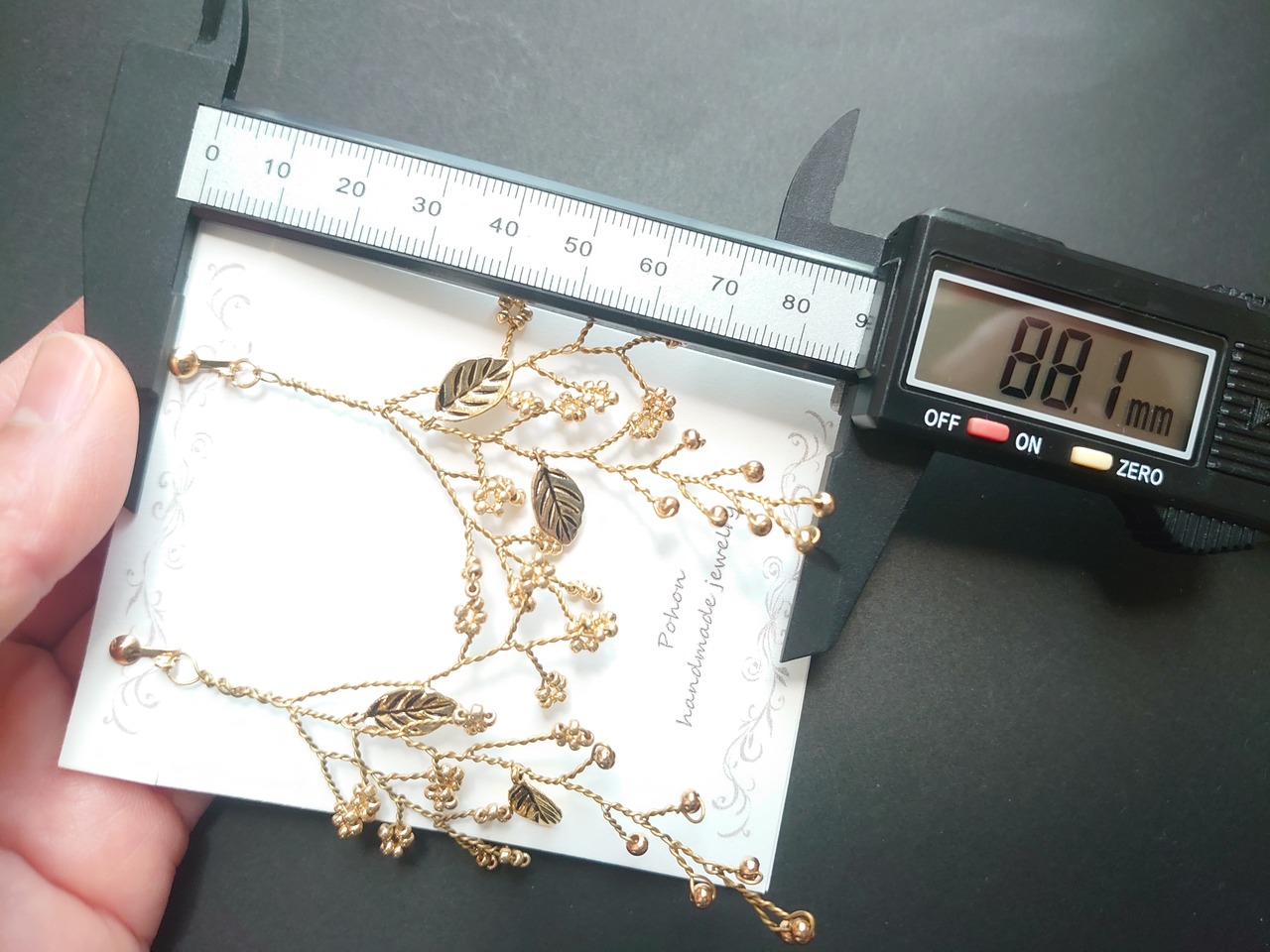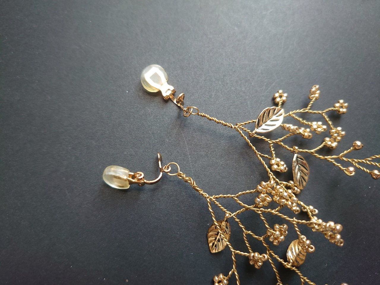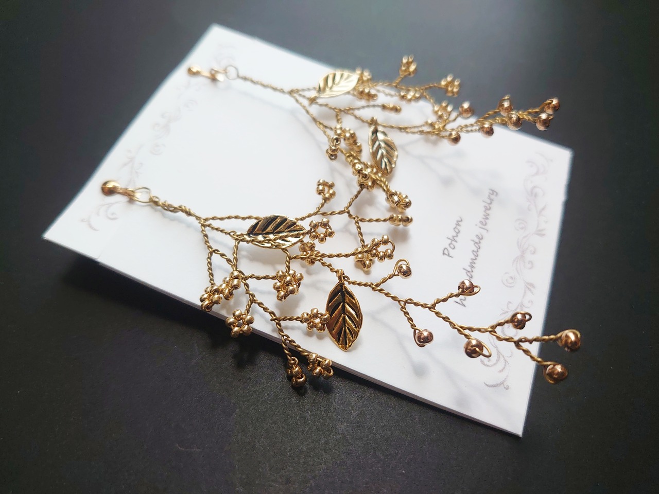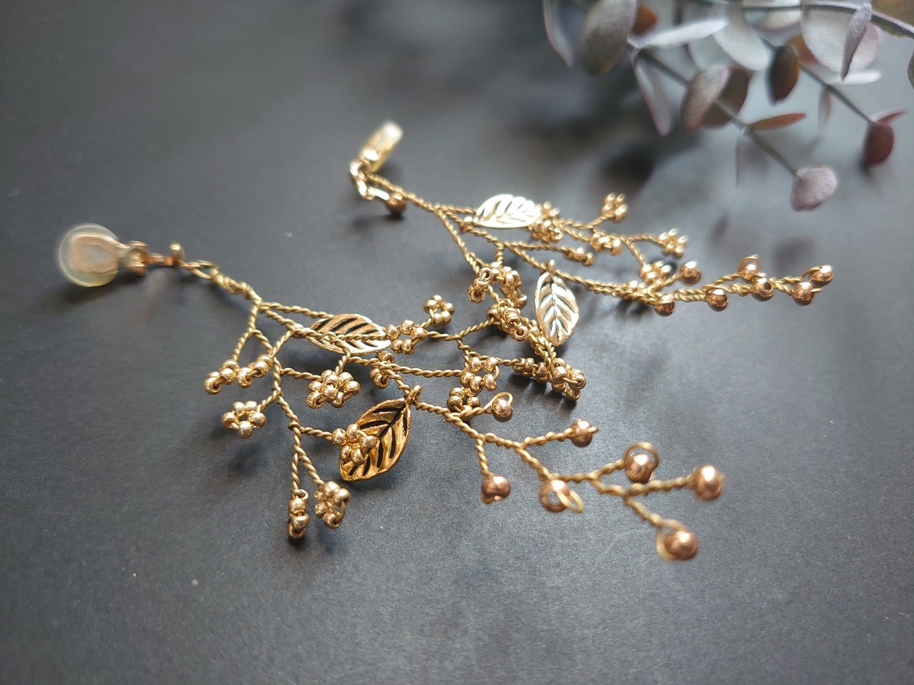 ワイヤー ビーズ 小枝 イヤリング 葉っぱ アンティーク調ゴールド色 ※金具変更可能 / PohonhandmadeJewelry f-00