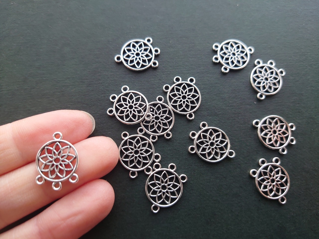 合金 ドリームキャッチャー 透かし フラワー 3連 コネクター アンティーク調 ロジウム色 6個