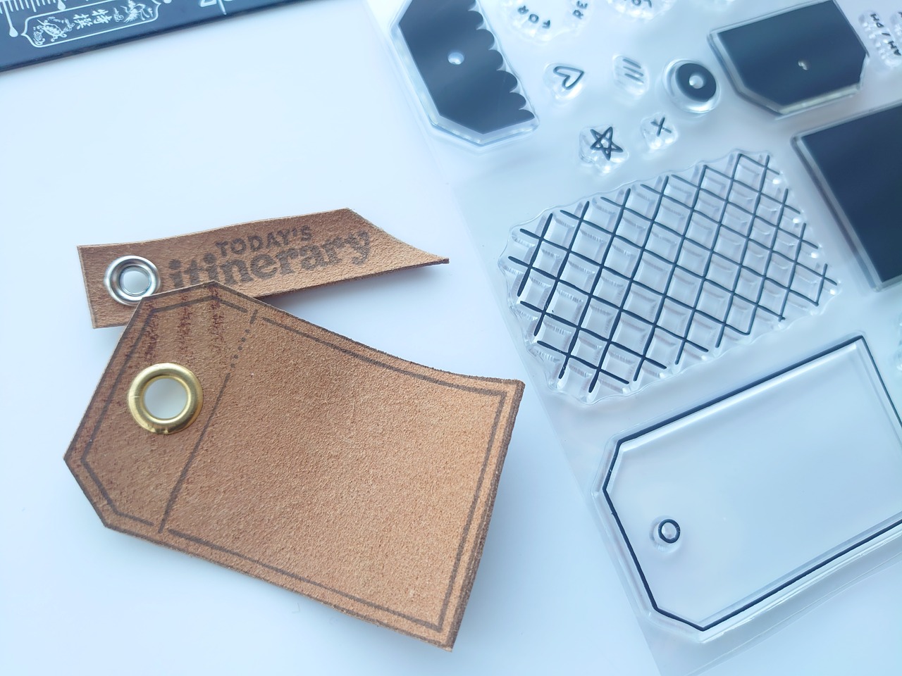 写真2枚目は、レザーに布用パッドでスタンプしてハトメ付けました。
