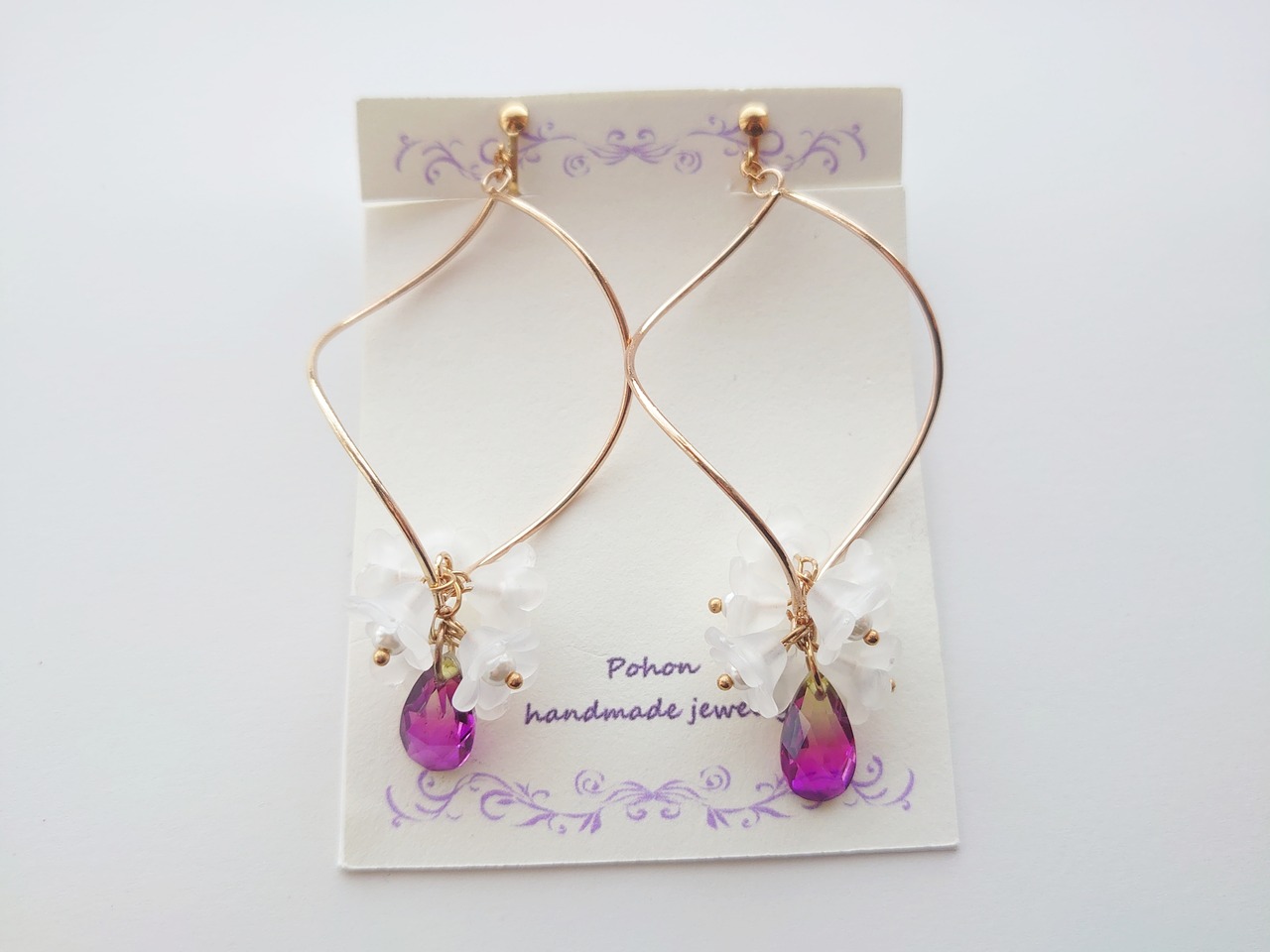 半額以下セール!ひねり ホワイトフラワー ガラスしずく イヤリング / PohonhandmadeJewelry