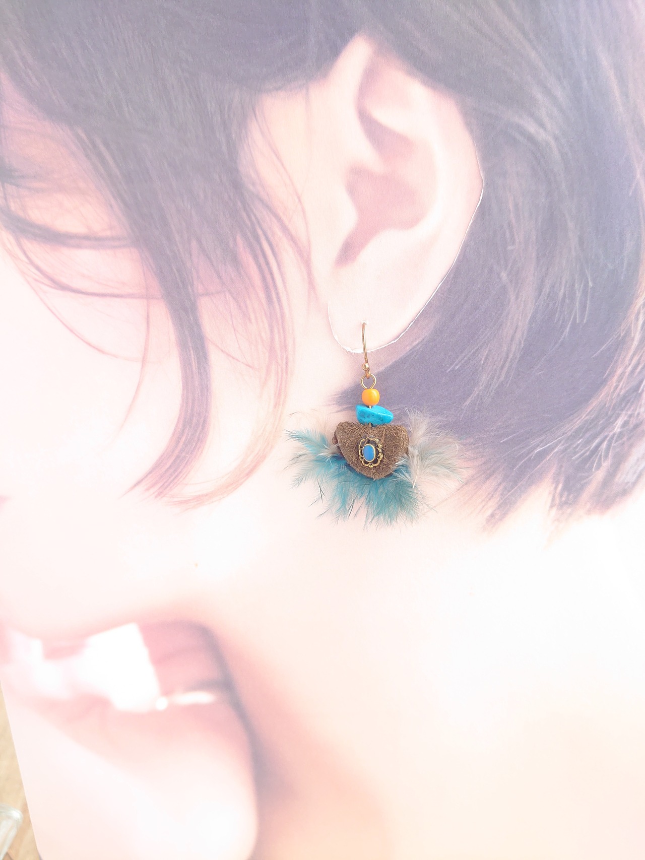 半額以下セール!エスニック レザーと羽根 フックピアス / PohonhandmadeJewelry