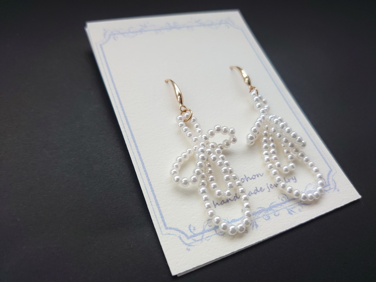 半額以下セール!パール調 ビーズリボン フック ピアス / PohonhandmadeJewelry
