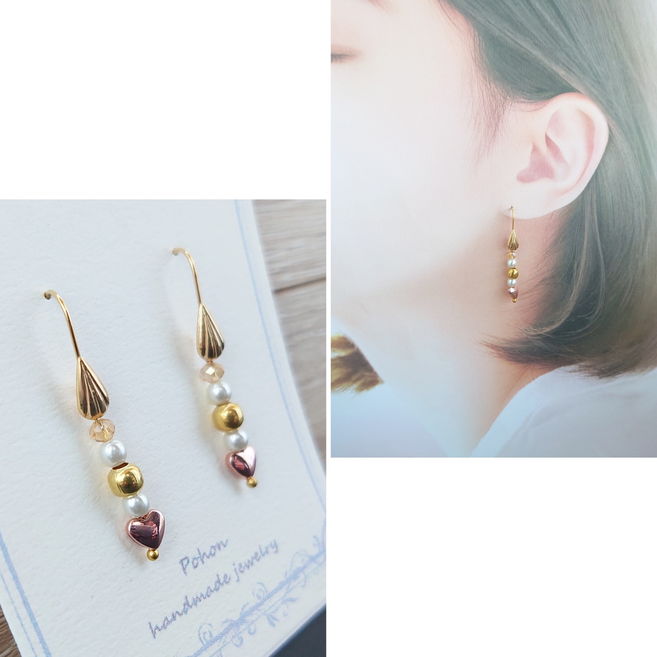 半額以下セール!ヘマタイトハート 18KGP本金メッキ フック ピアス / PohonhandmadeJewelry
