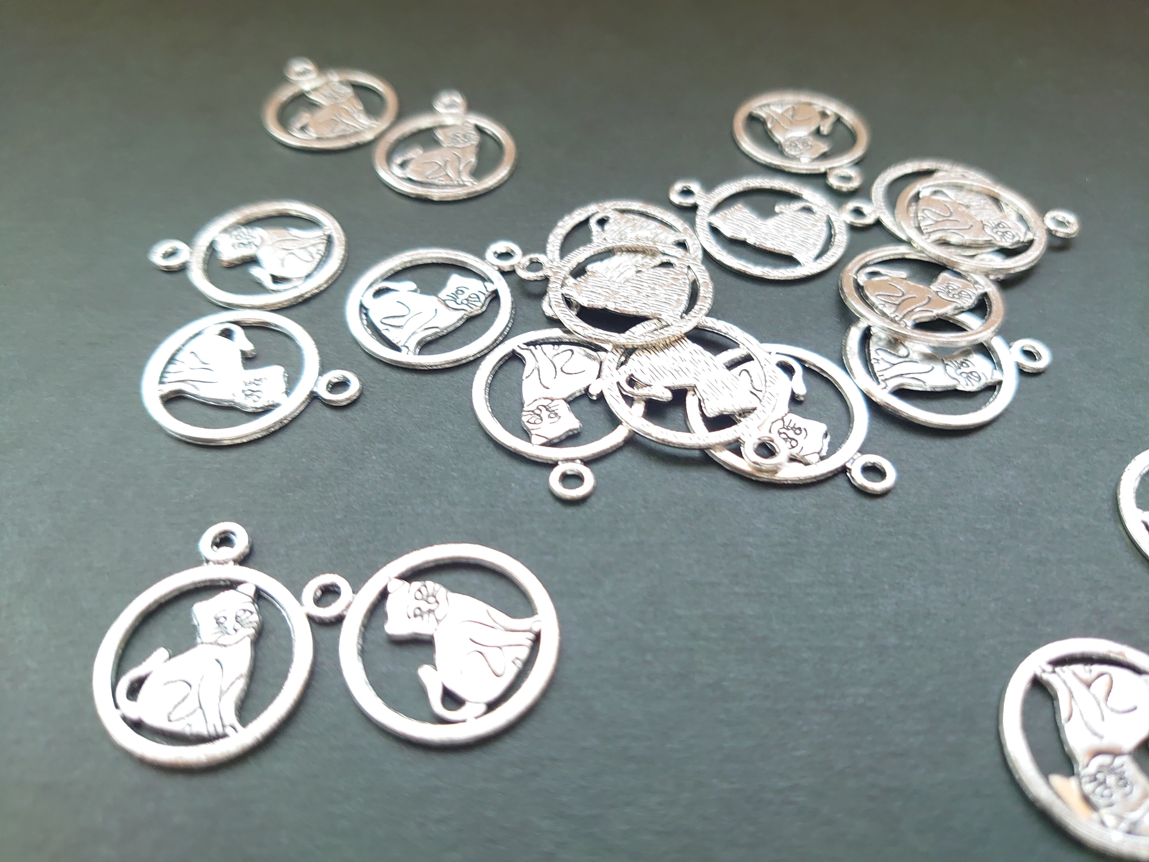【値下げ在庫限り】合金 ラウンド 猫 チャーム アンティーク調 ロジウム色 6個