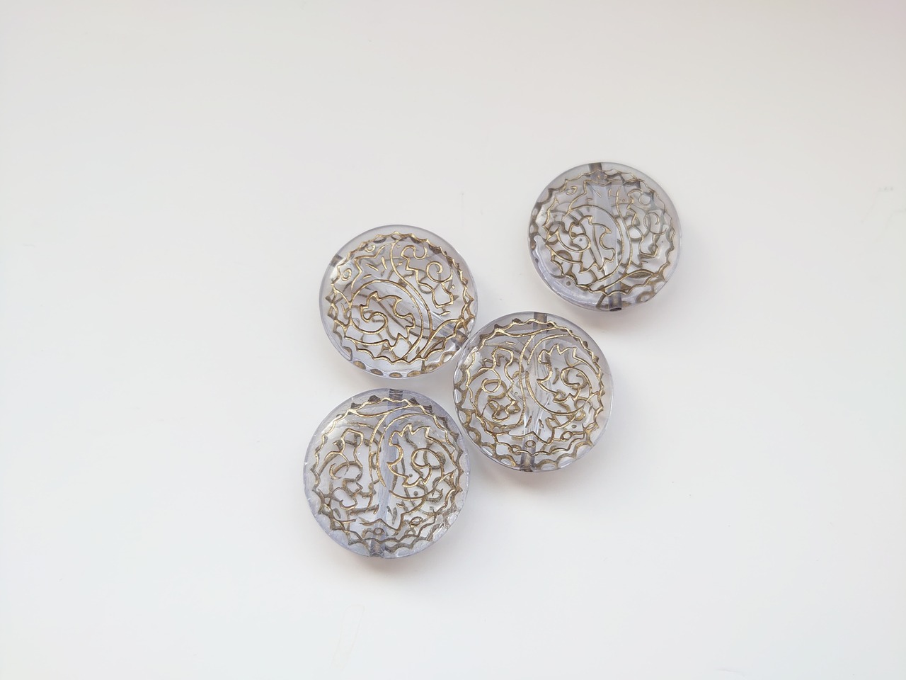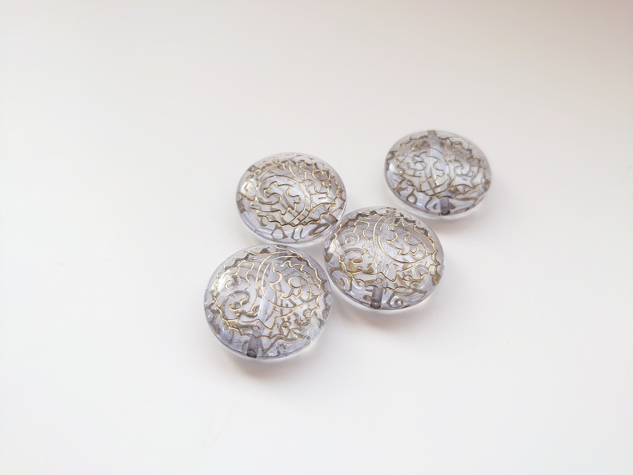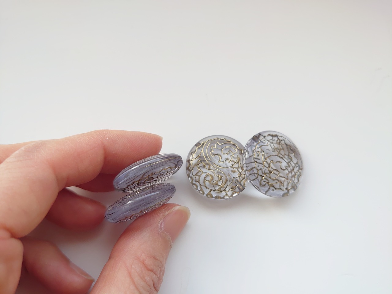 【値下げ在庫限り】手染めゴールドライン アンティーク調 ツタフラワー フラットラウンド ビーズ ネイビーブルー グレー 2個
