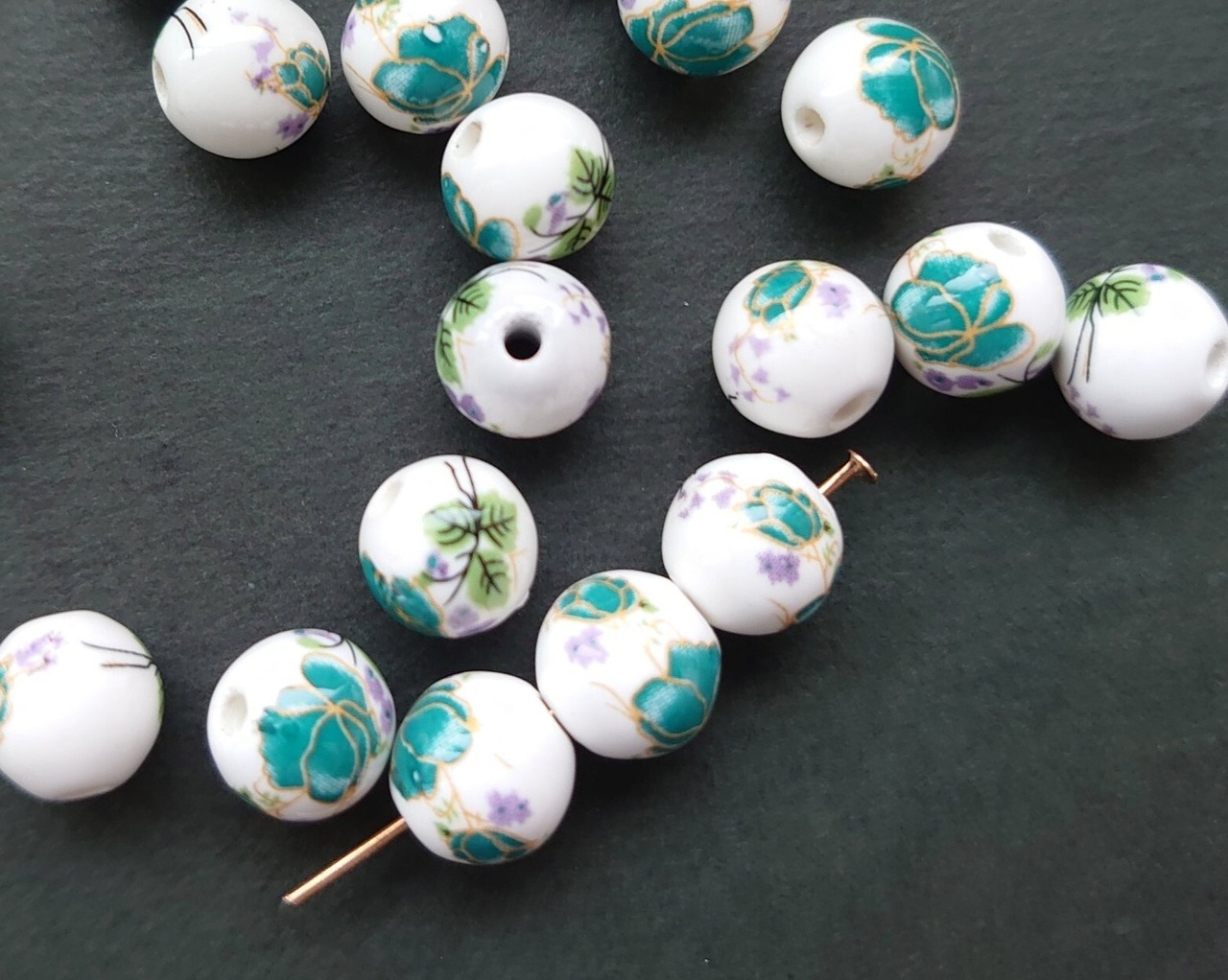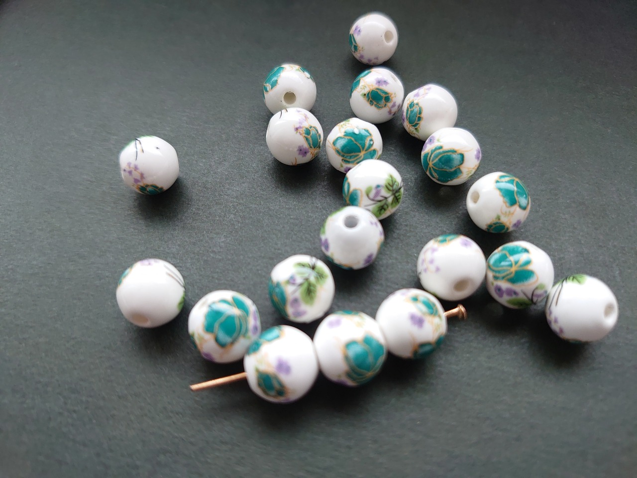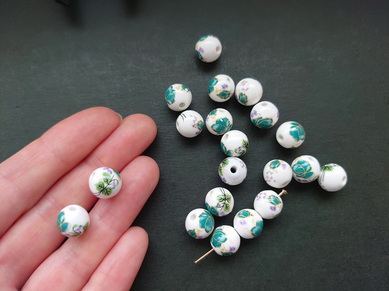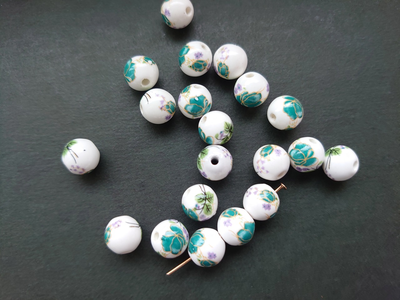 陶器 ラウンド ビーズ フラワー ブルーグリーン 4個