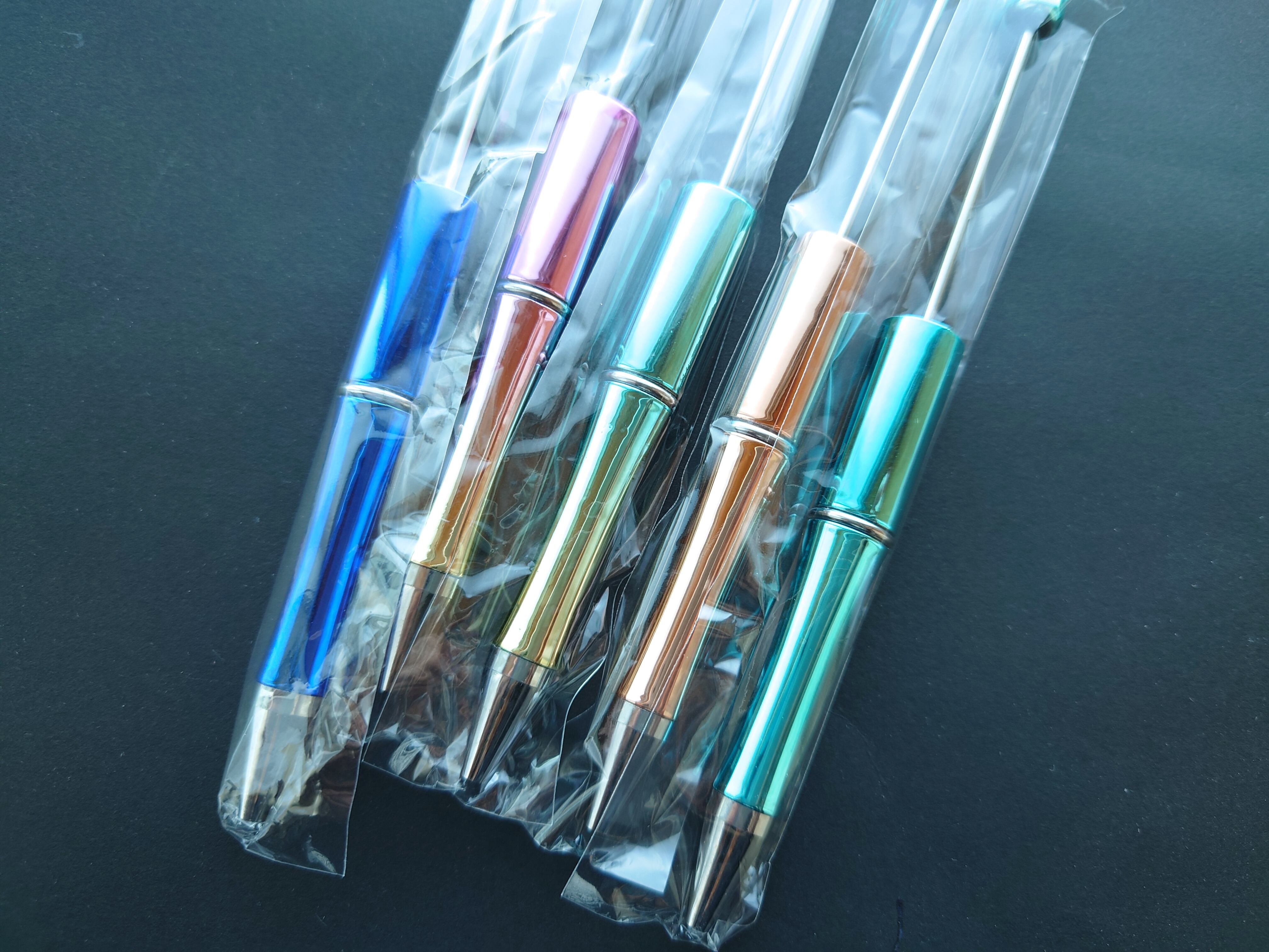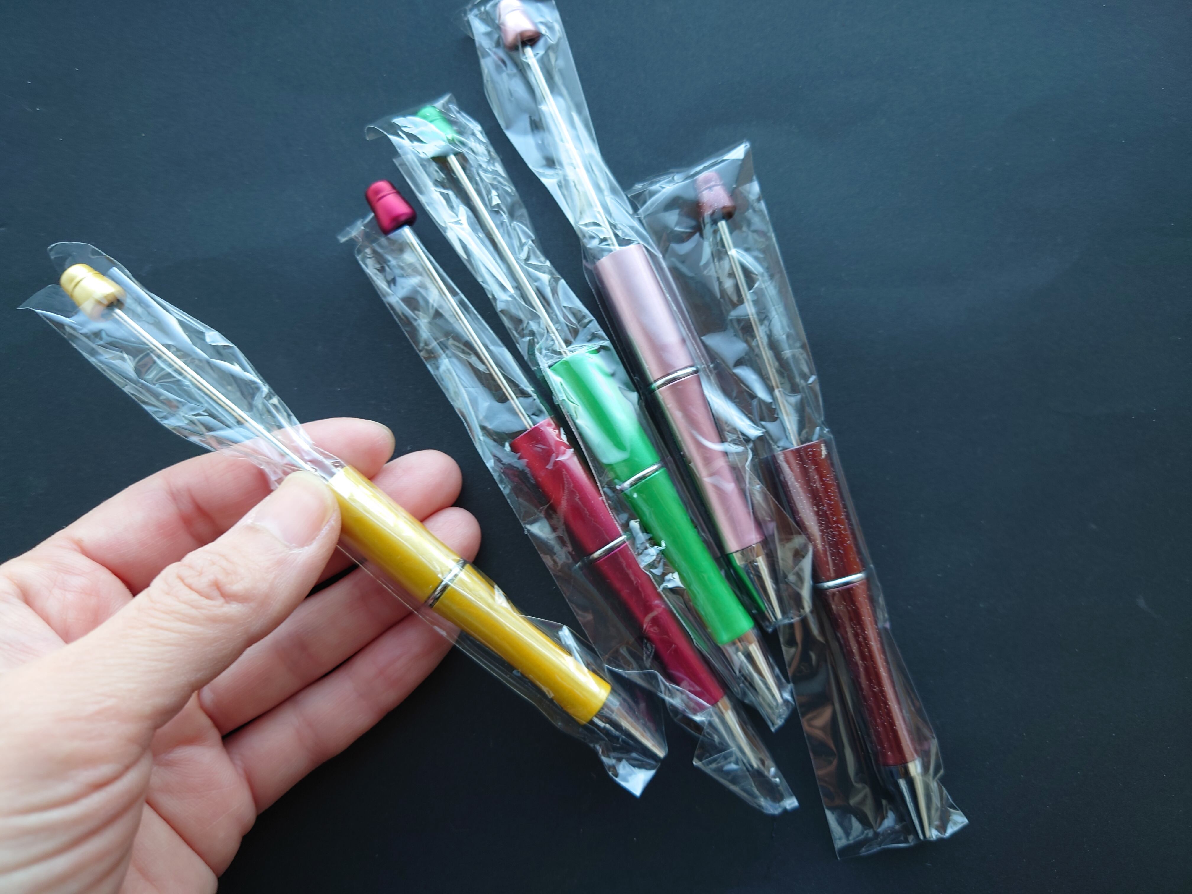 ビーズ等通せるボールペン。粘土やフェルトでオリジナルパーツを作って通せば更に個性的ボールペンの出来上がり。