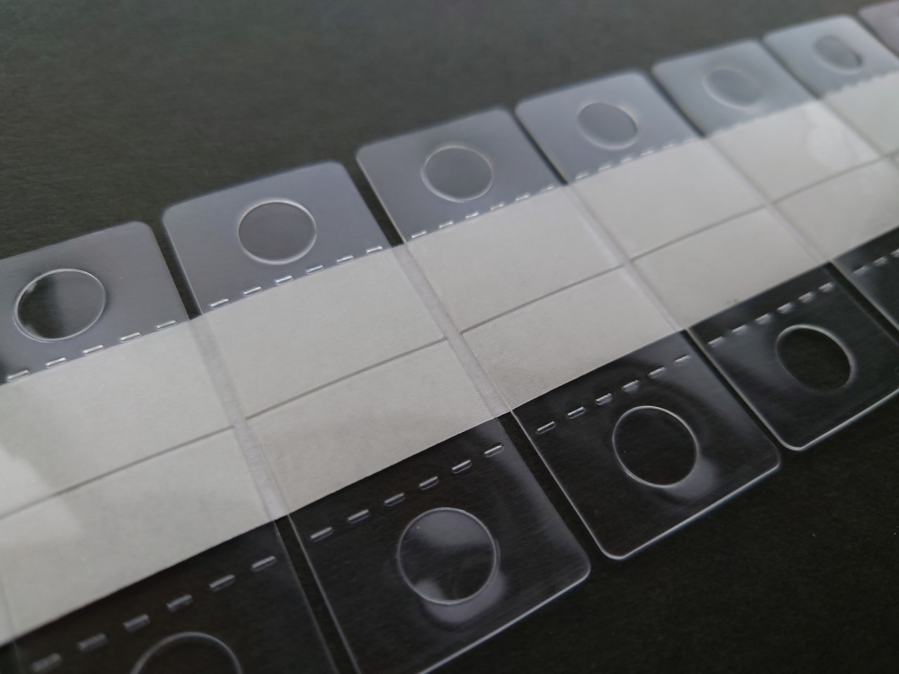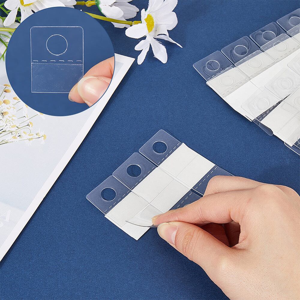 ・商品のディスプレイを一層、効果的にし、省スペース化にお役に立てる粘着剤付吊り下げタブです。